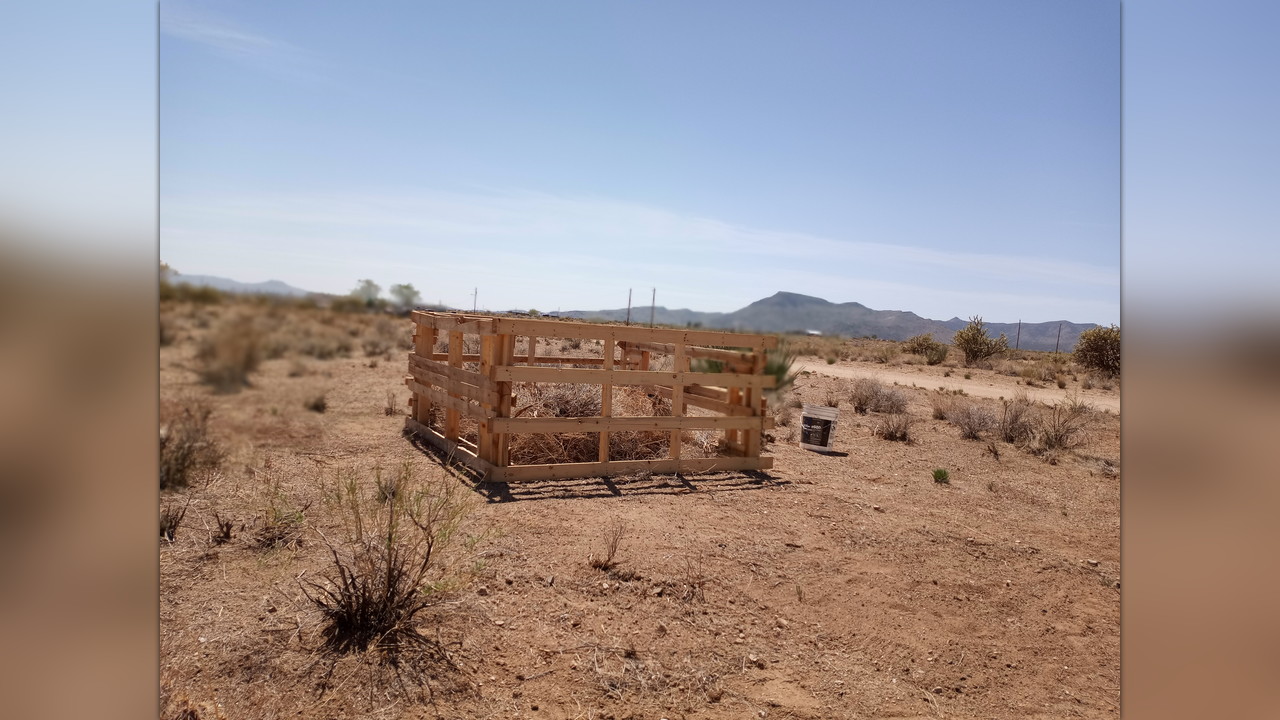 I bought two acres in the desert and there was nothing out there but cactus. Now there is a compost bin, my first structure.