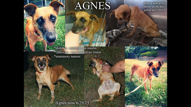 On Saturday May 30th, I noticed an older terrier mix drinking large amounts of water in a small kennel at the shelter. Knowing the shelter did not have a veterinarian on staff, we pulled this girl and had her immediately evaluated by our vet. Her blood sugar level was in the 500s. The vet determined that Agnes was diabetic, slightly anemic, several mammory tumors and cataracts in both eyes. Our next stop was North Davidson Vet Hospital, where she had a several day stay to be placed on insulin.