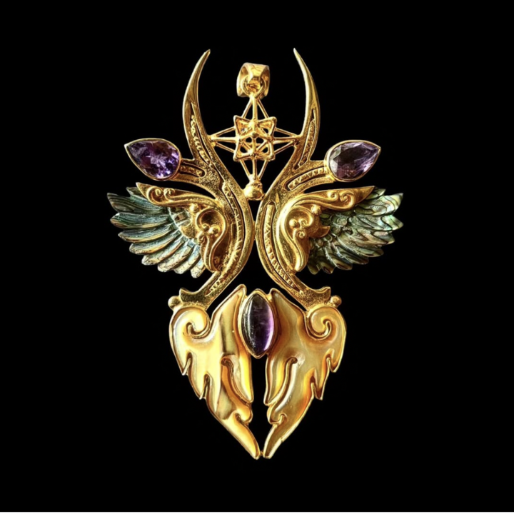 Citrine a sun energy and the amethyst carries the Violet flame the geometry a Solar star – {Stellated dodecahedron} Ganet at the point – Black shell wings that glisten with colour. The Shop price was £399 – now SALE @ £360 all inclusive -no extra shipping.