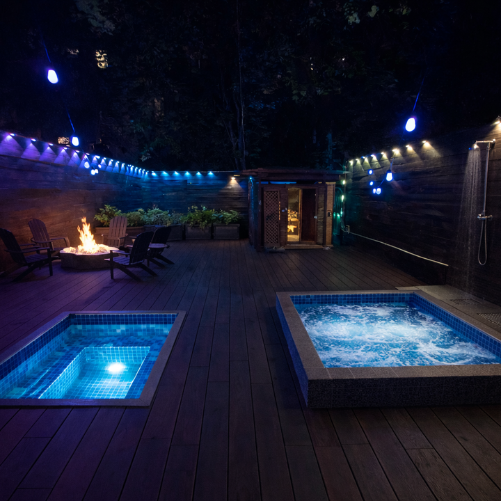A 10 person in ground hot tub, a 2 person cold plunge, a sauna, showers, and a huge deck to lounge about. So far we have the sauna and hot tub finished with the cold plunge almost there. -