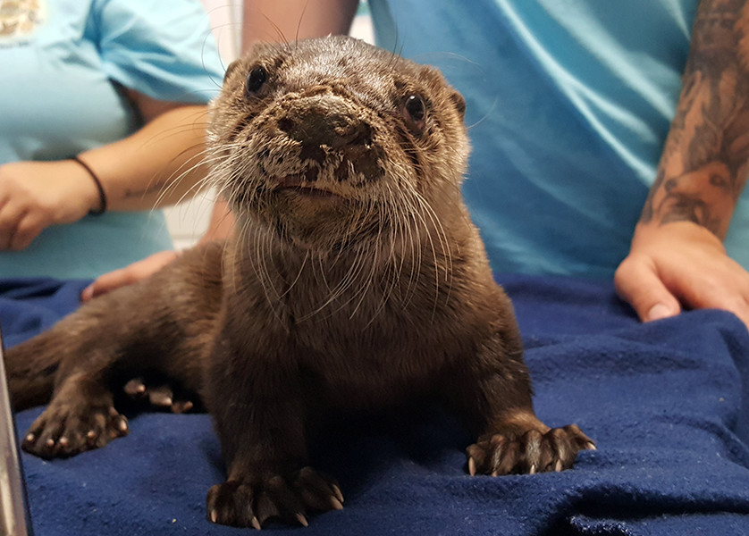 Nathan, Critter Care’s Animal Care Supervisor, was assigned to her care, a task he took to with great passion, nurturing his new charge. As the little otter grew, she revealed a lovely playful personality, ever ready to nip the hand that fed her. Nathan named her Orchid. After two months, Orchid was moved from Nathan’s little Otter Nursery to the outside Otter residence. There she was introduced to water, using a small children’s pool. At first, she was quite timid, but soon discovered that she loved to swim (just like an otter should) and was as comfortable in the water as on land! She happily made new friends with Oakley, and Orca, two other orphaned river otters that found their way to Critter Care, although Orca, the eldest and largest, had to be given supervised play dates due to her much larger size. None-the-less all three spent the summer happily playing and thriving in their new home! | Otto