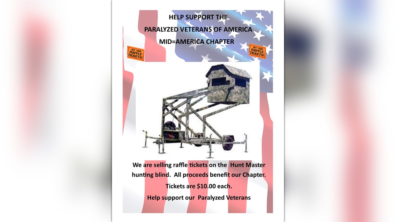 The Mid-America Chapter of the Paralyzed Veterans is selling tickets on the Huntmaster elevating, wheelchair accessible hunting blind. The tickets are $10.00 each. This Huntmaster elevates from ground level to 21 feet. This unit has all the options, solar panels to keep the dual 12 volt batteries charged, inside the blind there are trays on both side to hold all your supplies, a fold down seat, usb ports and lights. The unit can be towed easily behind most any vehicles. All proceeds after expenses benefit The Mid-America Paralyzed Veterans sports program.