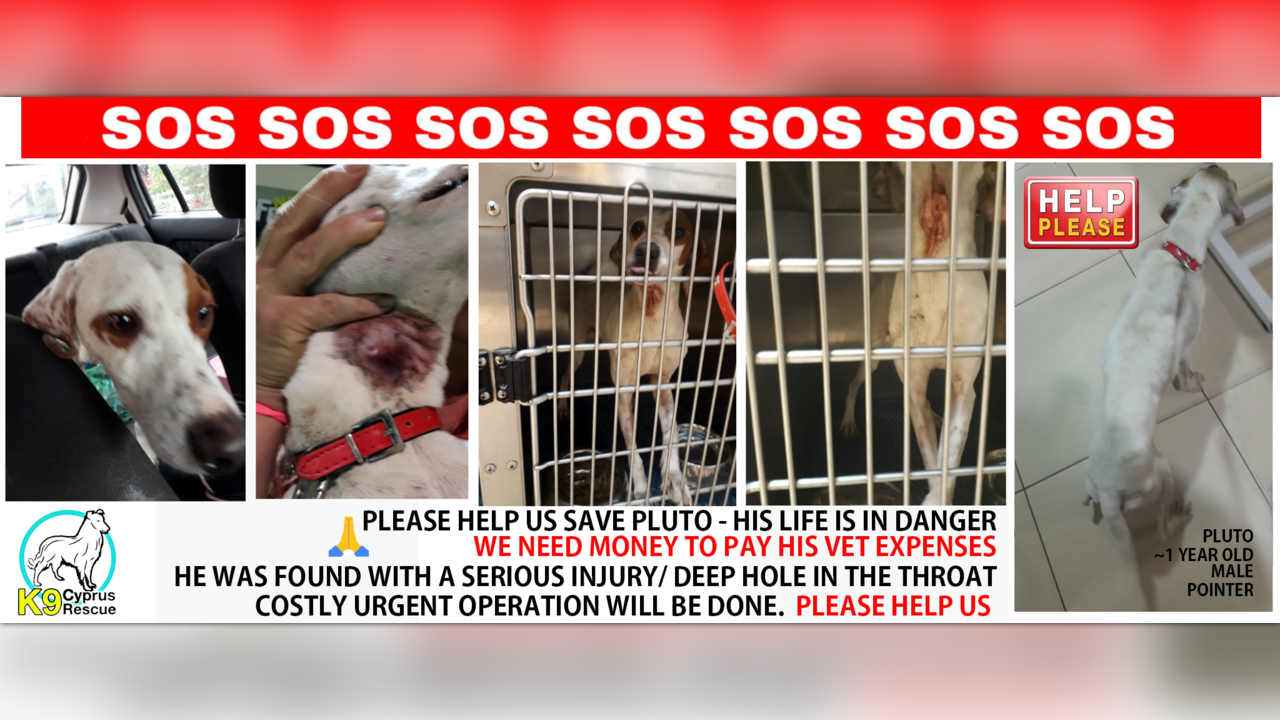 We hebben ons meteen naar de dierenarts gehaast, waar hij zal blijven, want zijn toestand is cruciaal. Pluto, zoals we hem genoemd hebben, is bijna 1 jaar oud, Pointer ras. Hij moet zo snel mogelijk geopereerd worden, omdat zijn wond op een moeilijke plek zit, maar daarvoor moet hij ook veel gewicht krijgen, om de operatie te kunnen overleven. Eerst heeft hij een bloedtest ondergaan. De resultaten zijn goed (schoon).