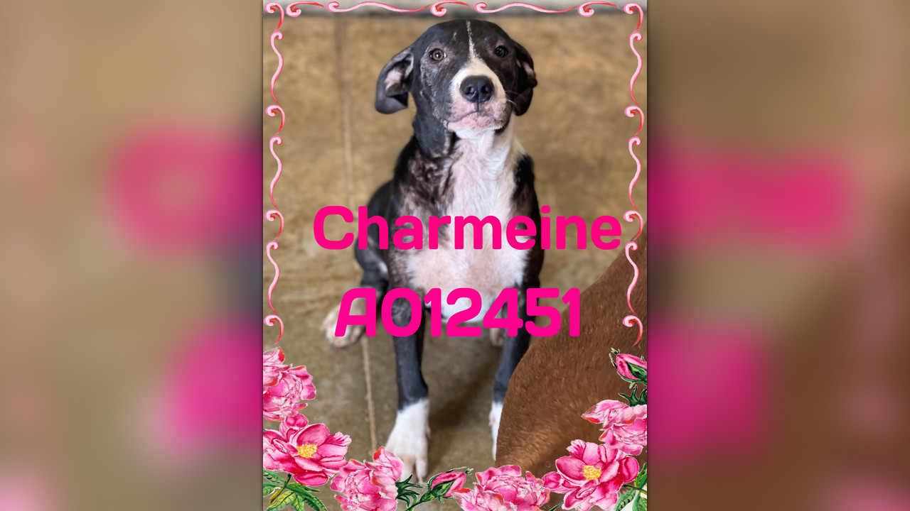 CHARMEINE is a sweet friendly LAB girl weighing 28 lbs on intake, dog and people friendly (kenneled with ADARA) (part of a hoarding situation) who finds herself in a crowded kill shelter through no fault of her own and now on the Urgent List.