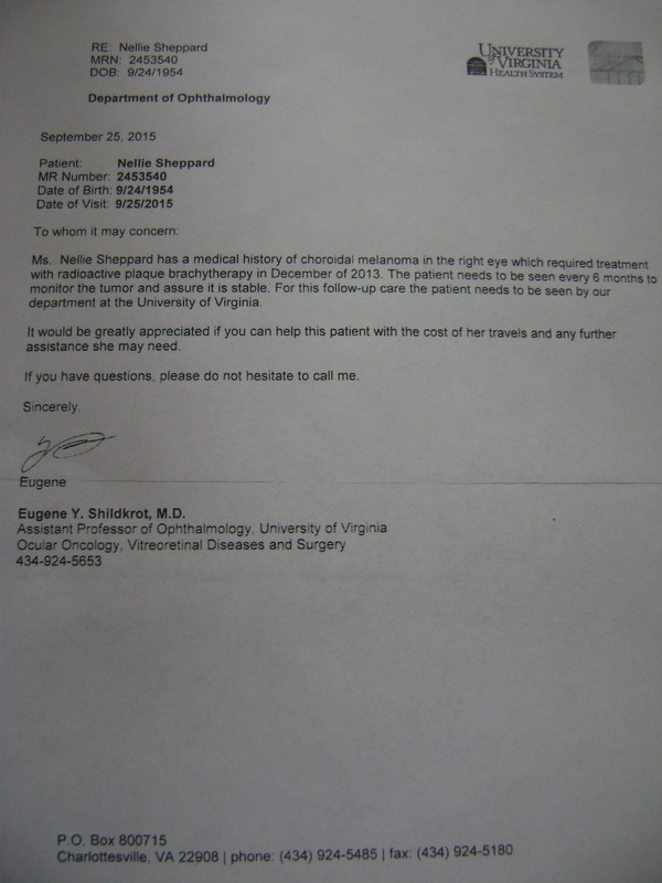 When we arrived for her first appointment at UVA the onocologist done lots of tests and the outcome was that he could do radiation treatment by building a plaque. The onocologist sent us over to the Emily Couric Cancer Center to have measurements done on the tumor so they could build the radiation plaque. Once the plaque was built we had to return back to UVA for mom to have surgery and have the plaque placed on the back of her right eyeball. The following day we returned back to the Onocologist for more tests to make sure the plaque had not shifted off of the tumor.