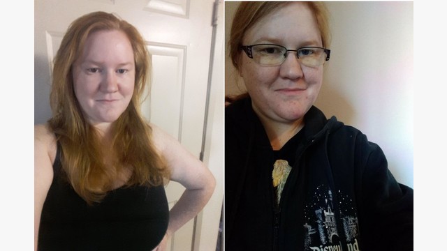 I have lost over 40 lbs, due to the fact that I cannot eat without severe pain in my stomach and chest.  (The picture on the right is before, and the picture on the left is from August. I have lost more weight since, too!) I'm using a cane now, as my muscles have atrophied and I feel dizzy all the time from lack of proper nutrition.