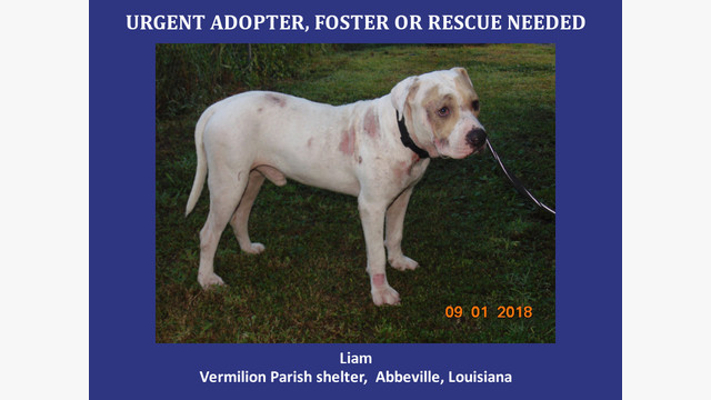 9/1/18 (other)- Liam is a male pit. Approximately 2 year old. Weight 46.6lbs. Available 9/16/18.