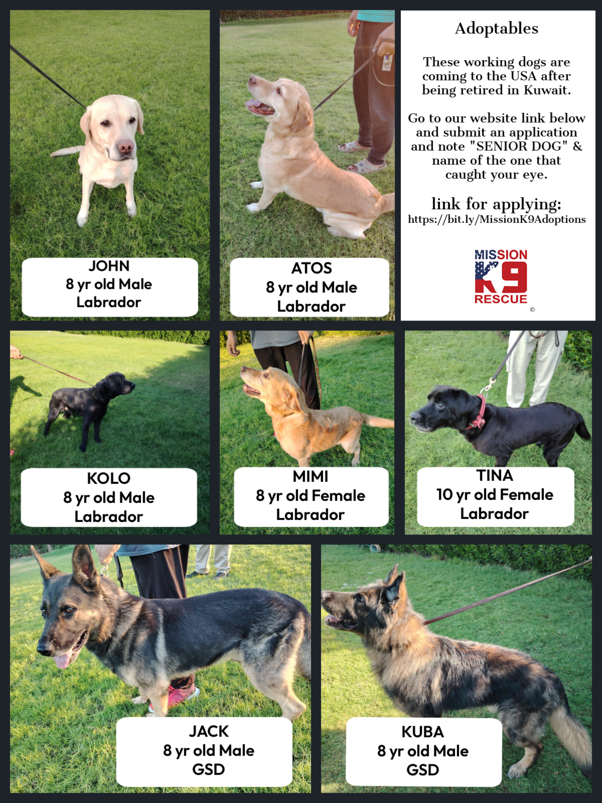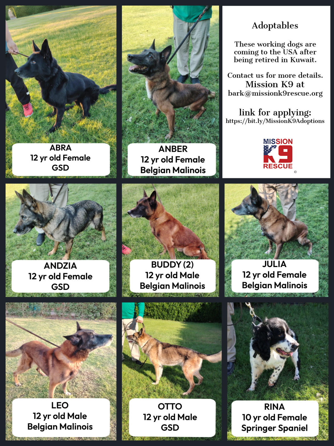 Go to Mission K9 to adopt any of the retired working dogs and submit an application.