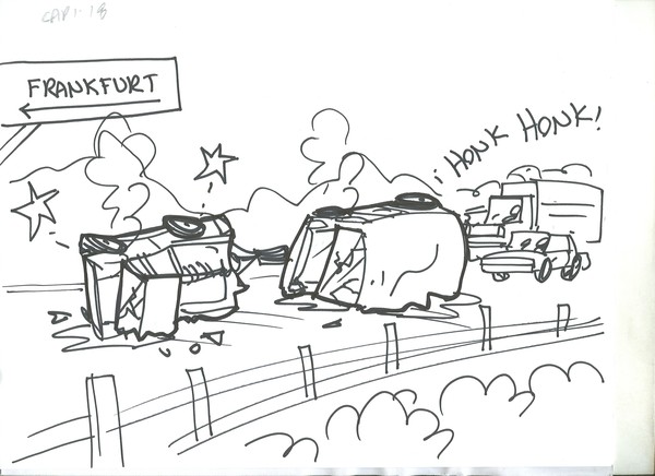 At the time we were toll, trying to reach the Highway, A POLICECAR stop us, because they notice that the ADAC car has 2 more passengers as they were aloud and also they had overweight!!! Also any Child seat for our little 2 years all girl!  But 5 minutes after...BIG SURPRICE, the 2 policeman let the driver from ADAC live the place. That was against the German low!!! Then the ADAC driver give gas and was driving fast. Suddenly it happens. All 3 vehicles TIP OVER to the left in the middle of the highway at 01:30 in the morning!!!