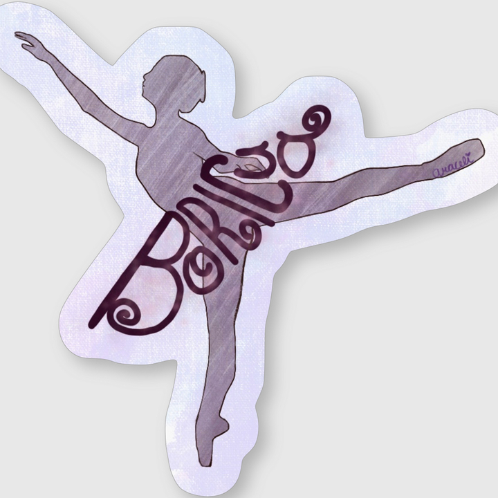 Printed shiny sticker of original artwork featuring a ballerina wearing her BORICUA pride encircled around her waist... stimulating a tutu. The word BORICUA is sparkly for extra bling! Artwork is modeled on the real life pre-professional ballerina Araceli Ilse.
