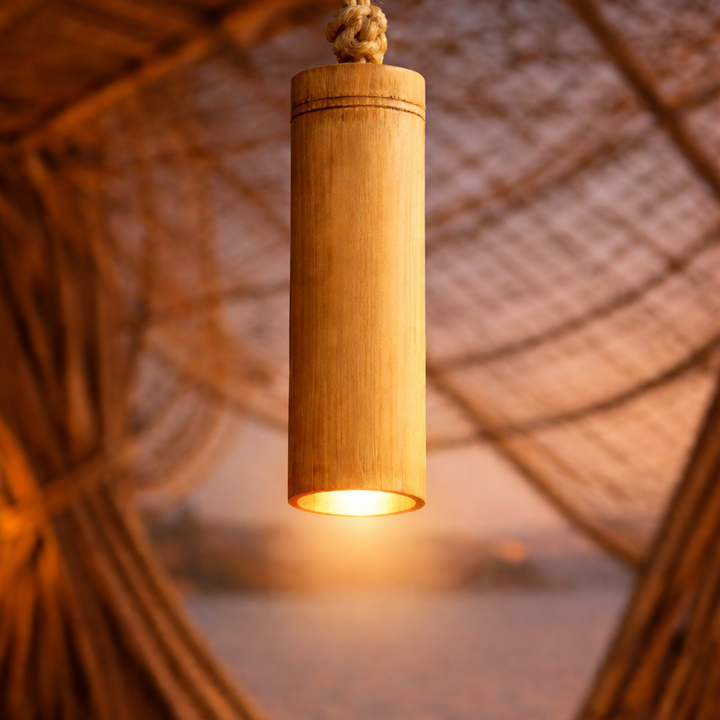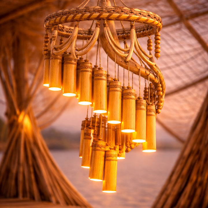 A sculptural bamboo chandelier designed as a flowing spiral of suspended poles, arranged in a cascading wave that echoes the movement of the Resonance form itself. Crafted from natural bamboo and suspended , it creates a striking architectural presence while embodying the motion, flow, and geometry of the installation.