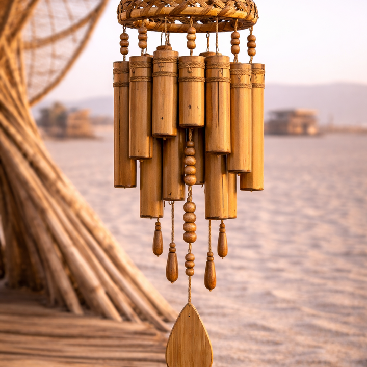 A layered and richly textured wind chime designed to deepen the voice of Resonance. Crafted from multiple bamboo elements suspended from a woven ring, this piece creates a fuller, more dimensional sound as the wind moves through its many tones and rhythms.