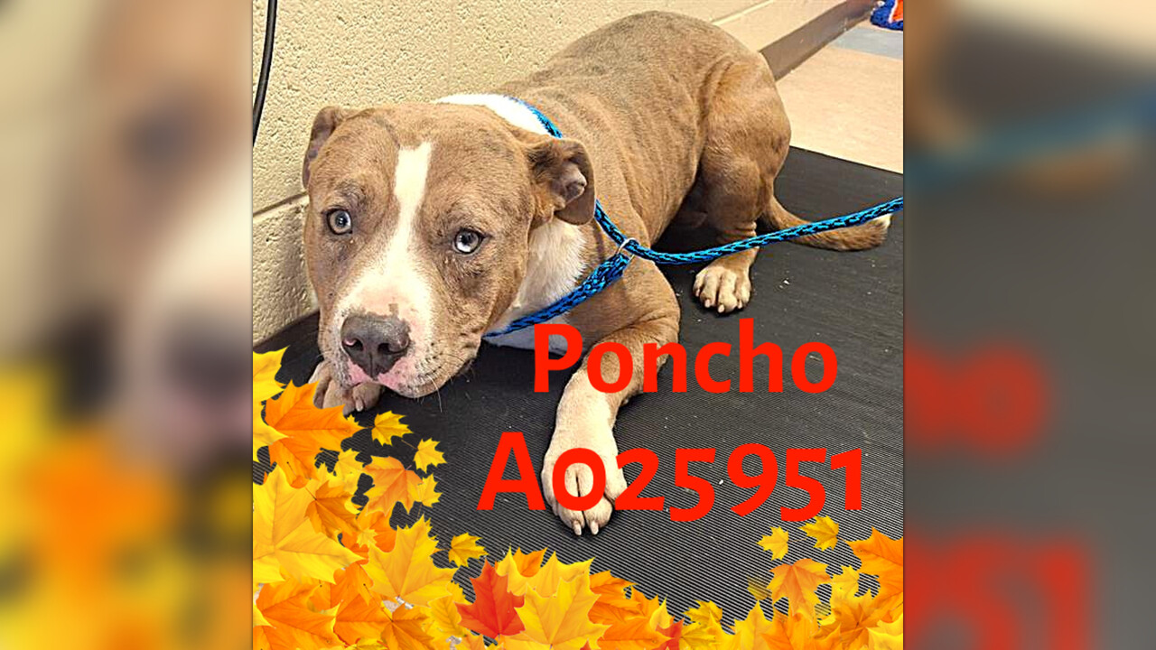 PONCHO - Male 2 year old weighing 45 lbs finds himself in a kill shelter through no fault of his own and now URGENT LIST FOR SPACE. He MUST have commitment by 4 pm on Friday November 21 or face being euthanized for space. (came in with Bravo - same home)