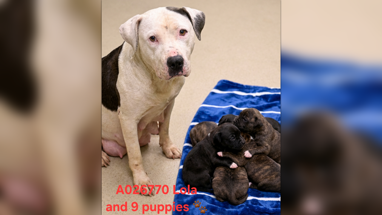 LOLA & 9 newborn puppies -finds herself in a kill shelter through no fault of her own with 9 nursing puppies. A shelter environment is no place for a mom with puppies. Lola and her puppies need out of the shelter immediately. Both shelters are packed.
