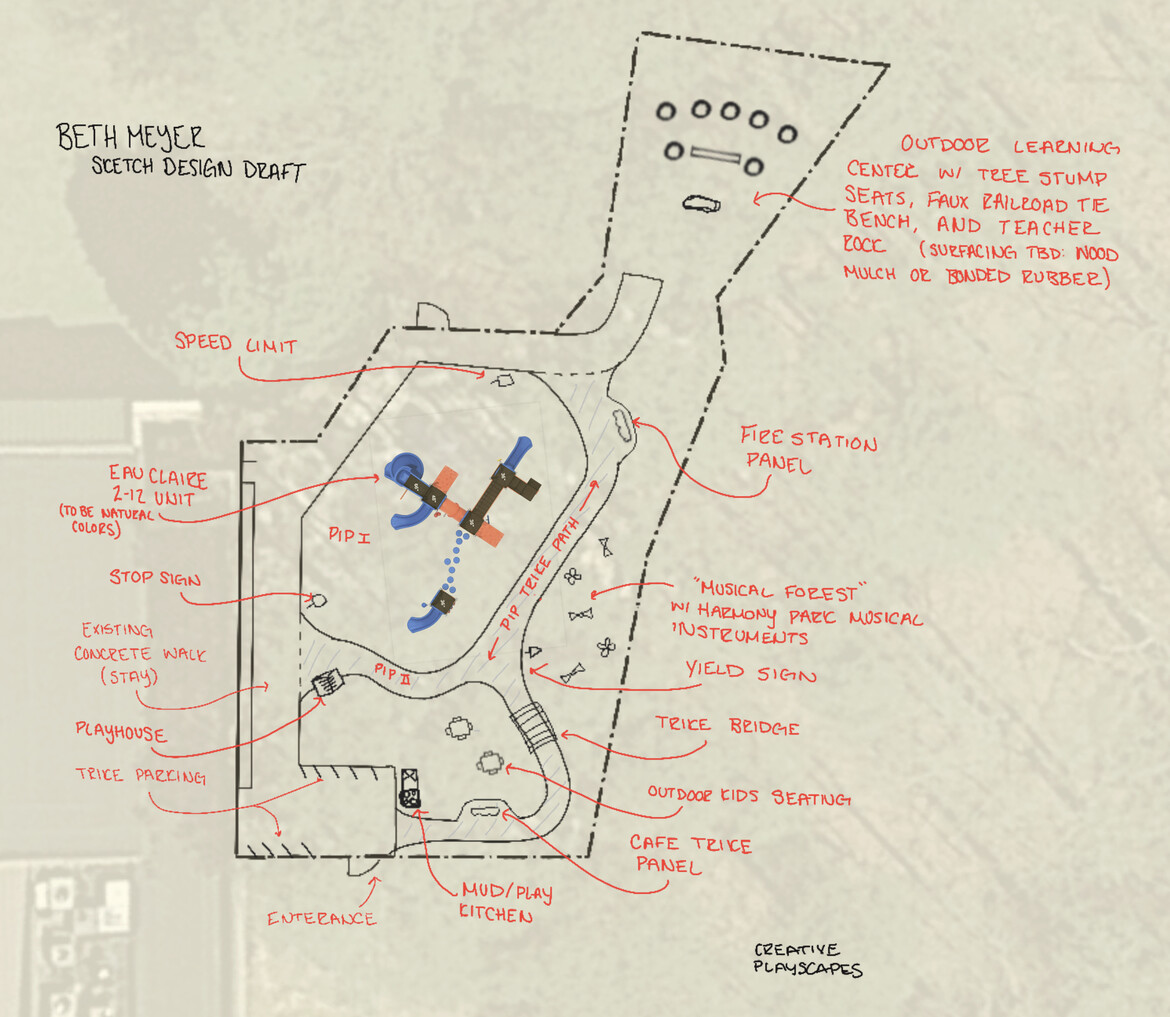 - Poured-in-place rubber surfacing (instead of sand) with an illuminated fall zone and a 4’ wide trike path with imaginative elements (e.g., traffic signs, parking spots, bridge.)
