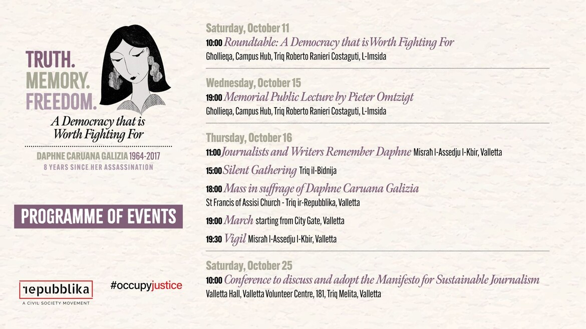At 3pm on 16 October 2017, Daphne Caruana Galizia was killed by a car bomb outside her home. Her life was taken away because she dedicated it to speaking truth to power. Her work as a journalist exposed and documented Malta’s capture at the hands of organised crime and corruption. Repubblika and #occupyjustice will mark 8 years since that dark day, renewing our commitment to truth and justice.