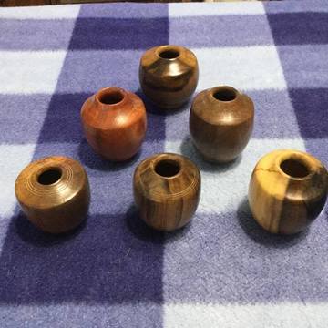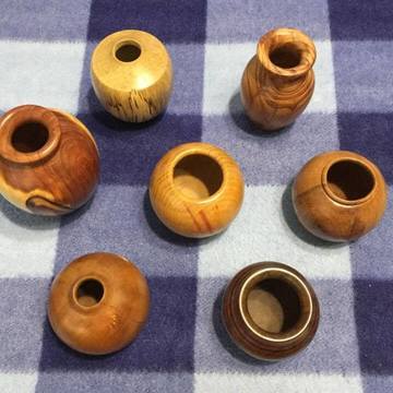 Hand Turned Decorative Miniature SW Pueblo Style Wood Vessels with natural defects: by Mets Lerweill, a retired professional wood turner extraordinaire owner and founder of "Wood You Believe". All wood material is found wood that Mets collected while on hikes in various parts of the NW US. This item was made in his studio located in Northern California. This item was created in 2011 and is from our personal collection. Top Row Item: 090315-TW/SWPV-04 2.5" x 2.4" Made from Magnolia Middle Row Left to Right Item: 090315-TW/SWPV-05 2.7" x 2.4" Made from Red Gum Item: 090315-TW/SWPV-01 2.8" x 2.3" Made from Walnut. Bottom Row Left to Right Item: 090315-TW/SWPV-03 2.2" x 2.2" Made from Walnut Item: 090315-TW/SWPV-02 2.6" x 2.1" Made from Walnut Item: 090315-TW/SWPV-06 2.7" x 2.3" Made from Magnolia For size comparison: Background fabric squares measure 2" x 4" Additional photos available upon request. This item is limited to stock on hand on a first come first serve basis.