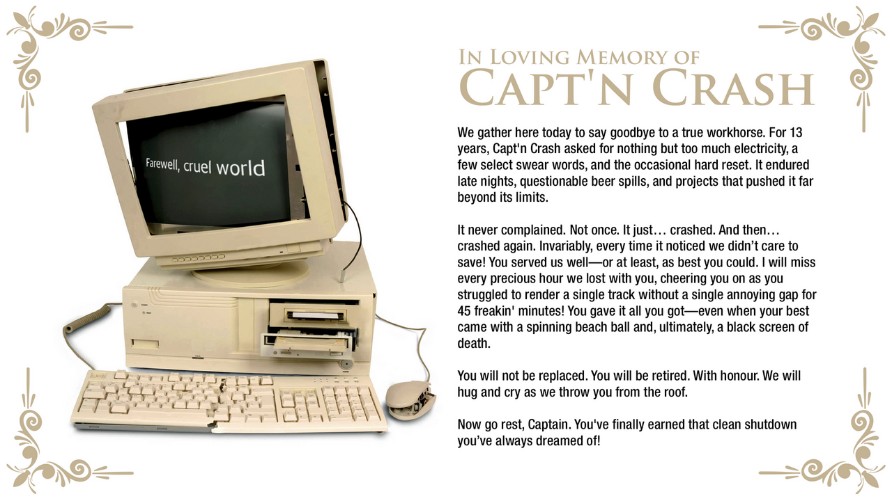 But a new challenge has presented itself and we are completely stalled. Our current workstation, faithful Capt'n Crash, has finally reached its limit and left us for good. The only solution is a brand new machine, and those sadly don't come cheap.