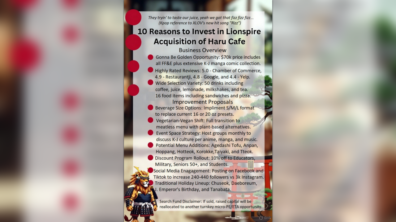 Micro-PE/ETA startup project to potentially purchase Haru Café, a turnkey Korean-Japanese fusion manga café in Sterling Heights, Michigan.