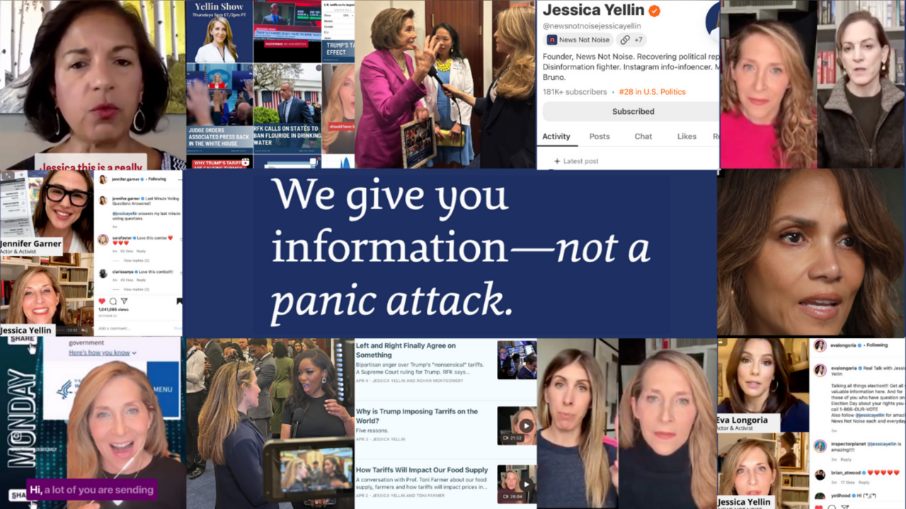 I'm Jessica Yellin the former Chief White House correspondent for CNN and a Webby, Emmy and Peabody award winning political reporter. Beginning in 2018, I was among the first reporters to build an audience on Instagram with short straight-to-camera videos explaining the news. To this day we keep it clear and calm to stay true to our mission: giving the audience information, not a panic attack.