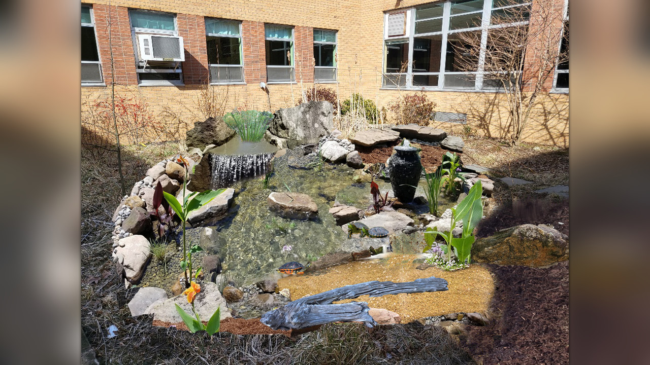To tie the space to the student experience, our goal is to create a centerpiece 11’ x 16’ pond with shallow shelves and numerous rocks. With your support, it will serve not only as a home for the animals, but also a living lab for our students. They will conduct water tests for chemistry, use the classroom when the weather cooperates and track and identify birds as part of Cornell University’s FeederWatch program.