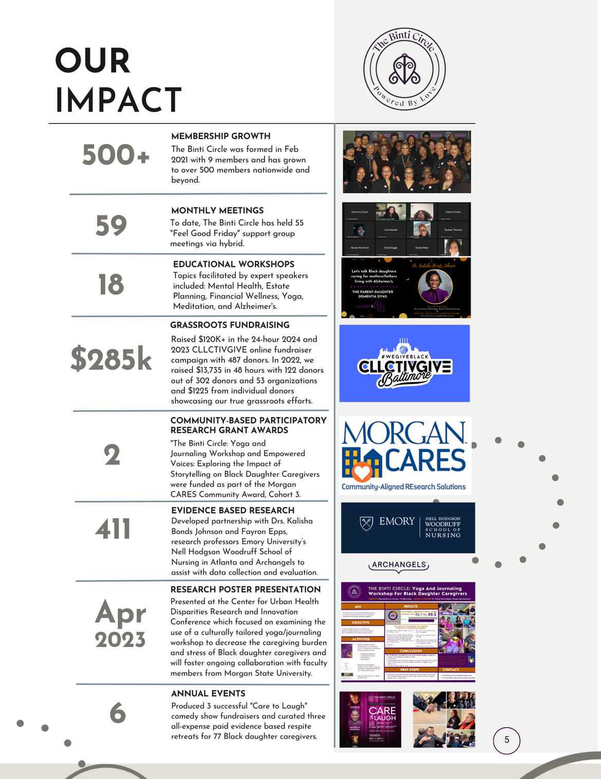 The Binti Circle's focus is on the importance of Black daughter caregivers supporting, encouraging, and empowering one another and becoming a community of holistically well, Black family caregivers – in mind, body, and spirit. In order to continue our programming, we need your help!
