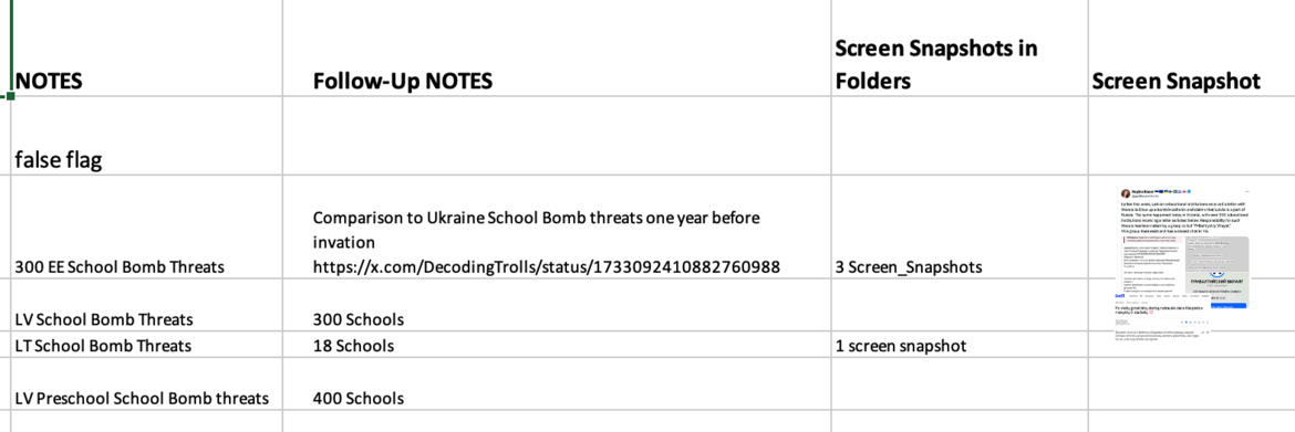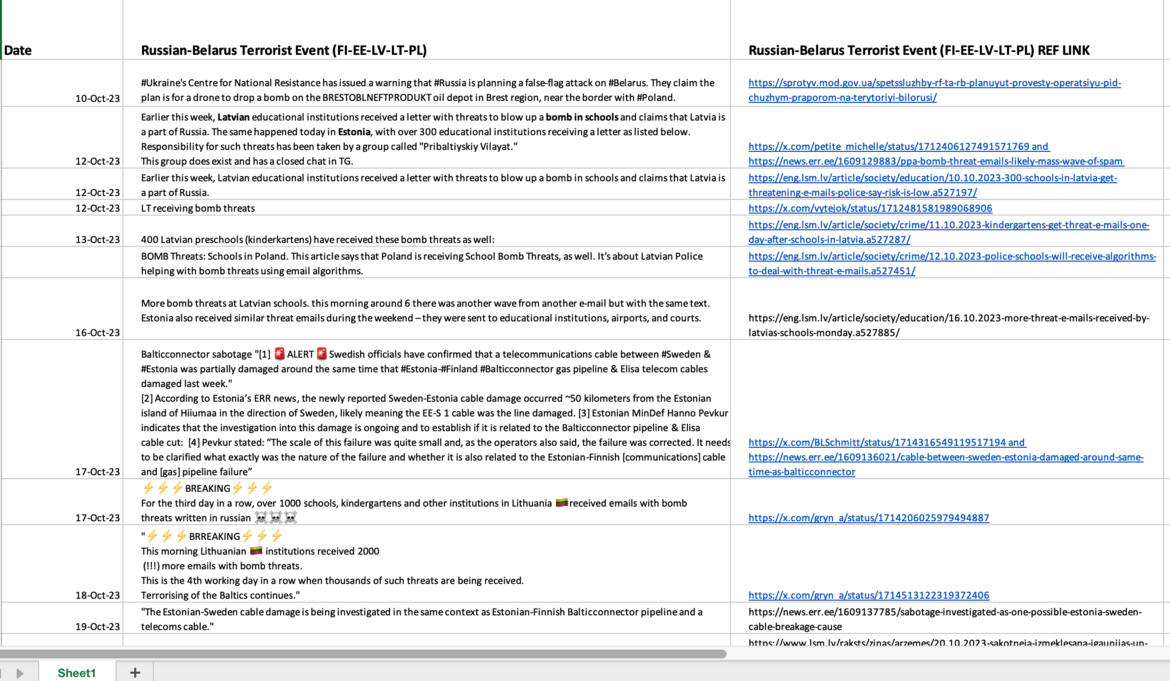 Initiated in second week of October 2023, when, in the same week: 1) 1000s of schools received bomb threats in the five countries and 2) the Balticconnector line in the Baltic Sea was cut. Continue data collecting to now.