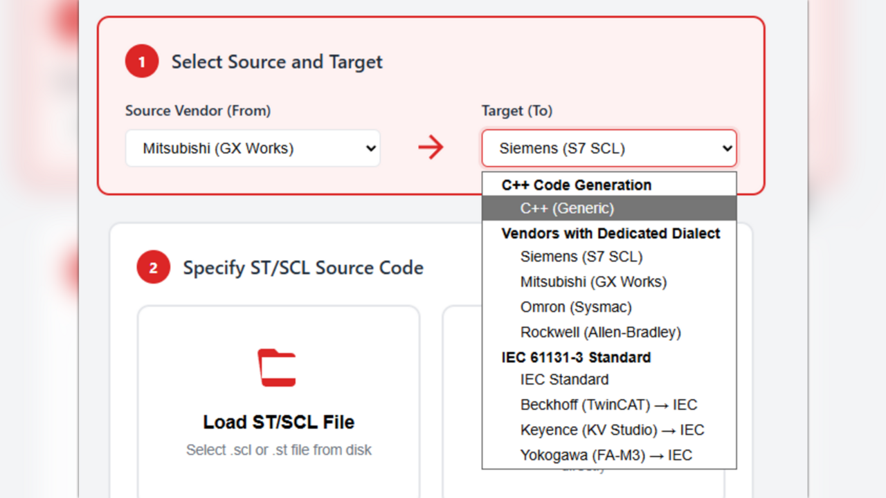 This tool converts Structured Text (ST) code used by various PLC vendors into ST code for other vendors, or into high-level programming languages. Unlike simple regex-based string replacements, this conversion is powered by a robust and advanced parsing architecture.