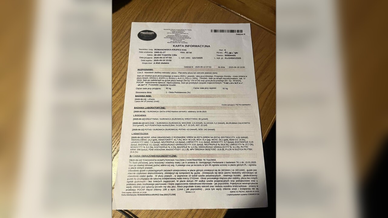Today I am in a late stage of the disease. I breathe with an oxygen concentrator and live alone, about 90 km from Warsaw. Every hospital trip is hard. I no longer receive systemic therapy. In practice I was told to wait passively. Yet I know that private immunotherapy with atezolizumab could give me more time—its monthly cost (~25,000 PLN / ~£5,000 / ~$6,000) is far beyond my means.