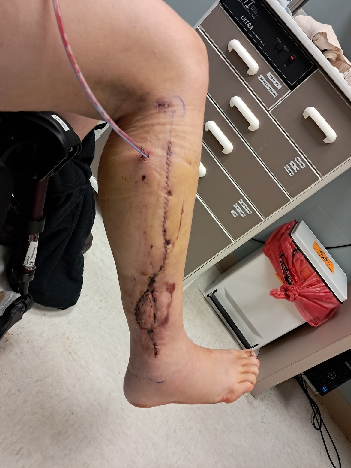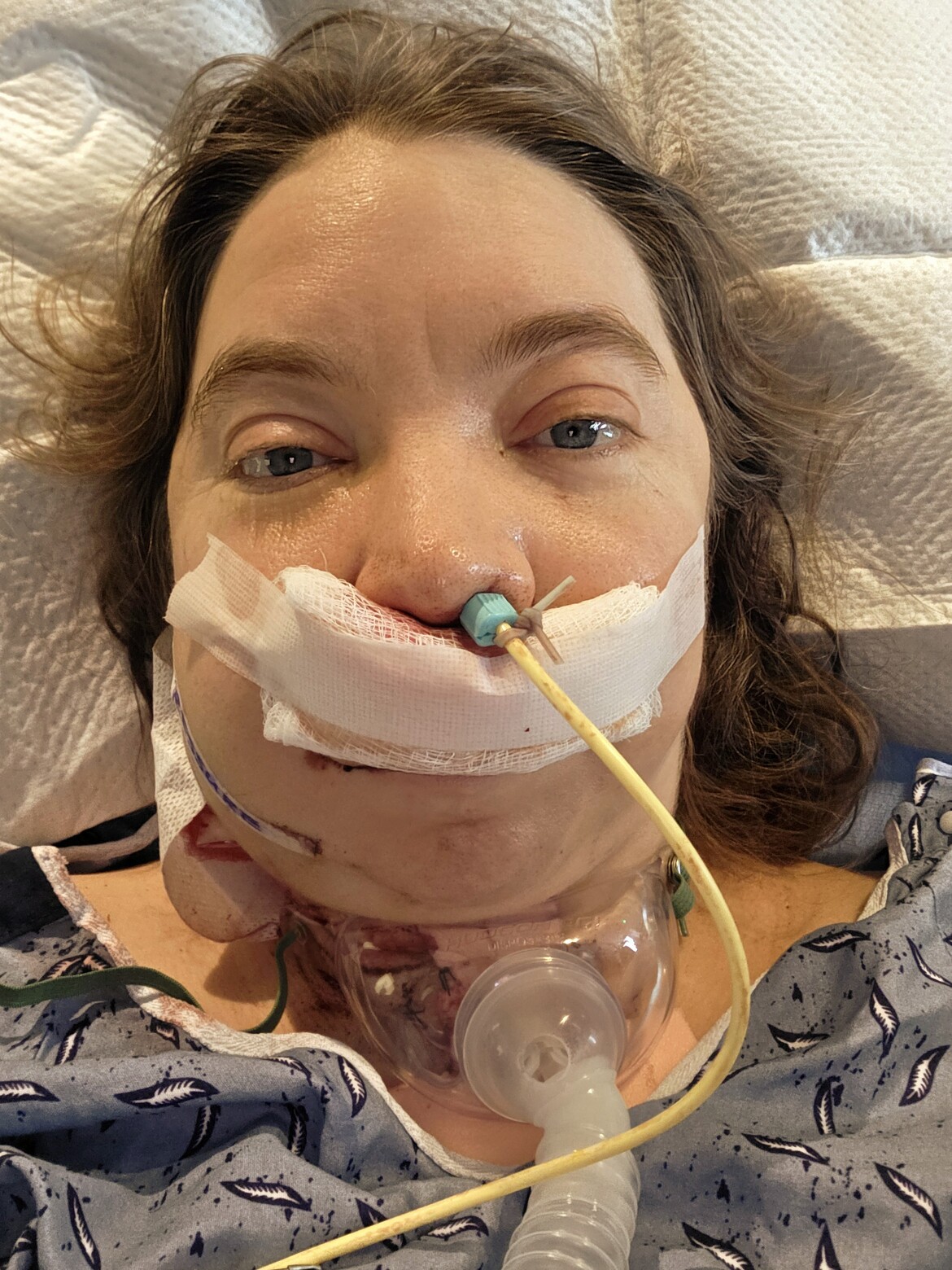 This procedure is called a maxillectomy with fibula free flap, wherein a benign lesion was removed from my jaw, and my fibula + leg veins are used to rebuild the bone loss of the jaw.