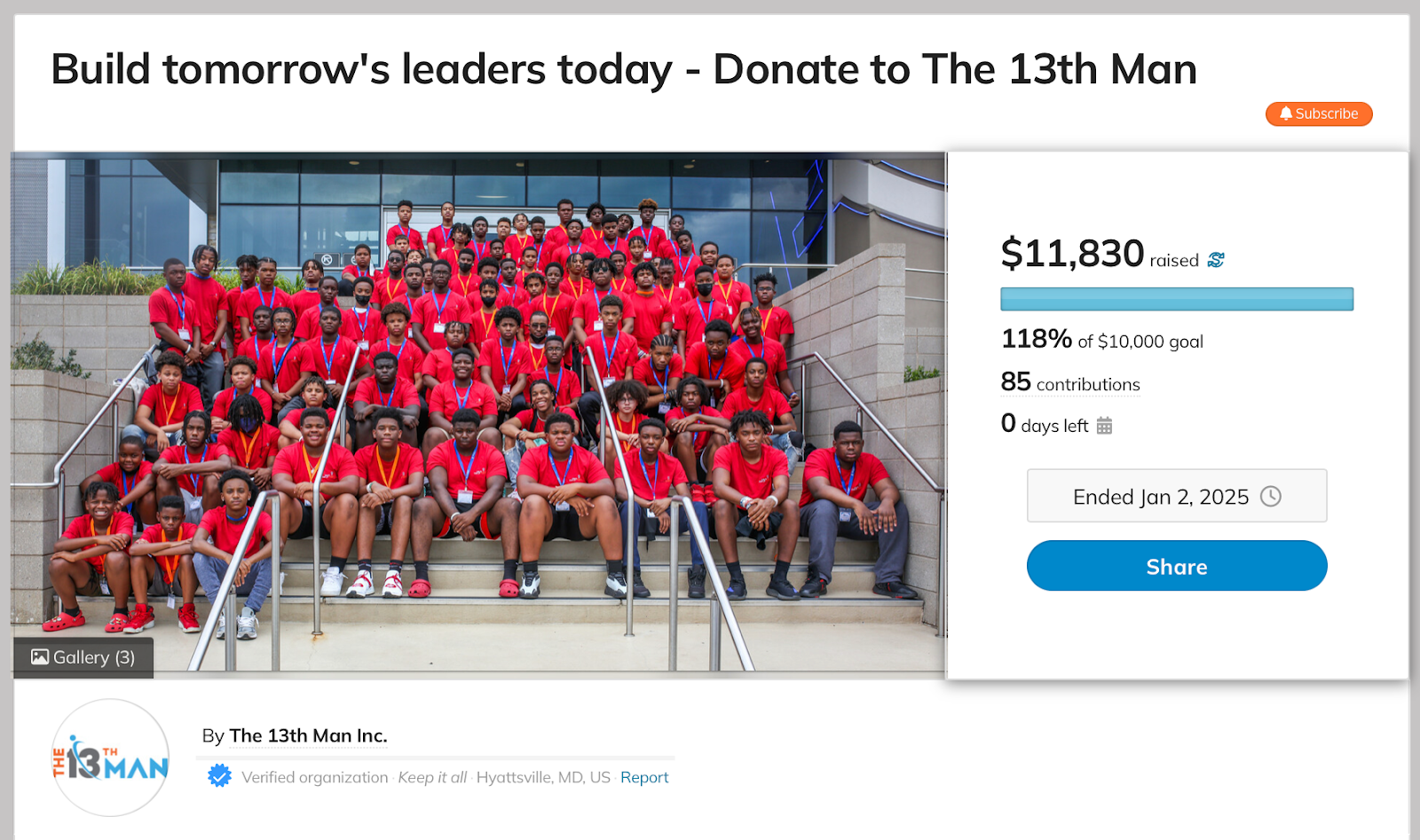 📝 The more information you provide to potential supporters, the more likely they are to give. By clearly outlining their programs and describing each one’s purpose and impact, The 13th Man ensured their audience felt informed and connected to the tangible outcomes of their contribution.