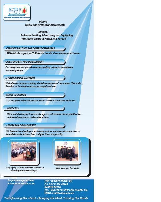 Contribute towards empowering Kenyans towards sustainable livelihoods with the Fruit Bearers' Initiative (FBI). We are a non-profit organization based in Nairobi, Kenya that provides training opportunities for wealth creation to reduce dependence on external resources.