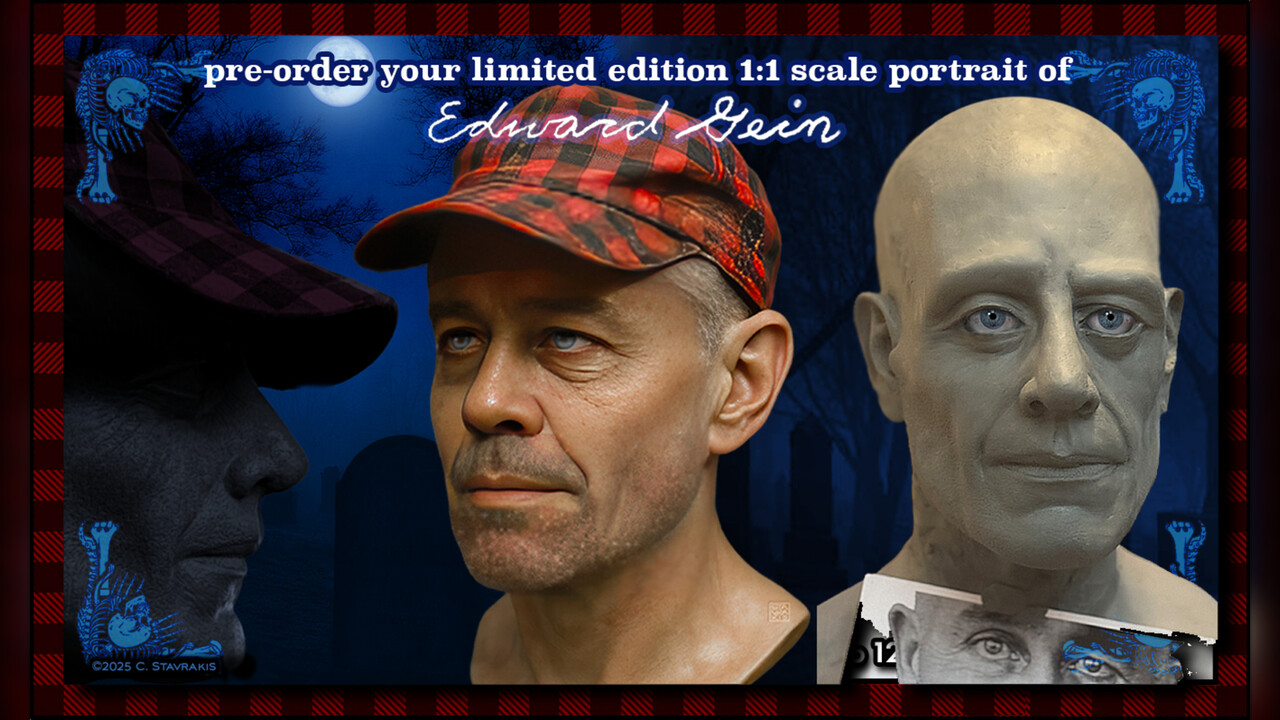 To that end, I've begun working on a couple of new limited edition projects, hopefully subjects of interest. Your contributions here will allow me to purchase the supplies I'll need to make this run of busts and hopefully a few more until I'm up to speed. This life-sized bust of Edward Theodore Gein (1906–1984) is my first such release, with other portraits or characterizations to follow in the months to come (your suggestions are welcome!).