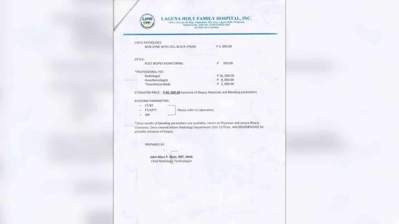 - Some lab test were conducted already like CT scan and ultrasound last 2023, and two doctors suggested (Dr. Santiago from Laguna Doctors Hospital and Dr. Merca from Laguna Holy Family Hospital) that they need to extract and do invasive radiology to get a sample from the unidentified lump to know what medication or treatment is suitable to it for my father to get well.