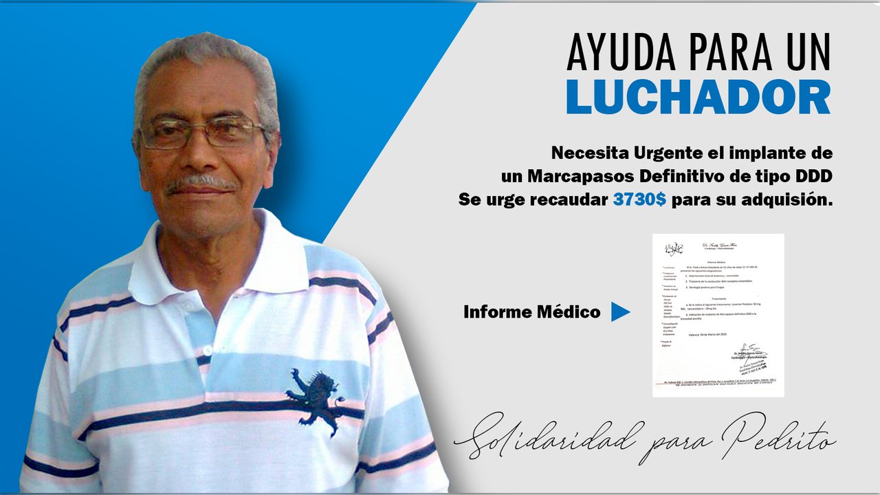 Actualmente padece un trastorno de la conducción; BAV completo sintomático y amerita implante de MARCAPASOS DEFINITIVO DDD a la brevedad posible. Debido a la crisis que atraviesa nuestro país es imposible para nosotros acceder a este equipo de manera privada, y las instituciones gubernamentales se encuentran casi sin servicio por lo que hemos visto en la necesidad de recuperar fondos para lograr la meta de 3730 dólares, por Lo que abre una campaña en Fund Razr es la vía que mejor visualizamos, Ayudanos A CONSEGUIR UN MARCAPASOS para Pedrito, hombre honesto, trabajador, deportista, padre, abuelo, amigo, UN LUCHADOR