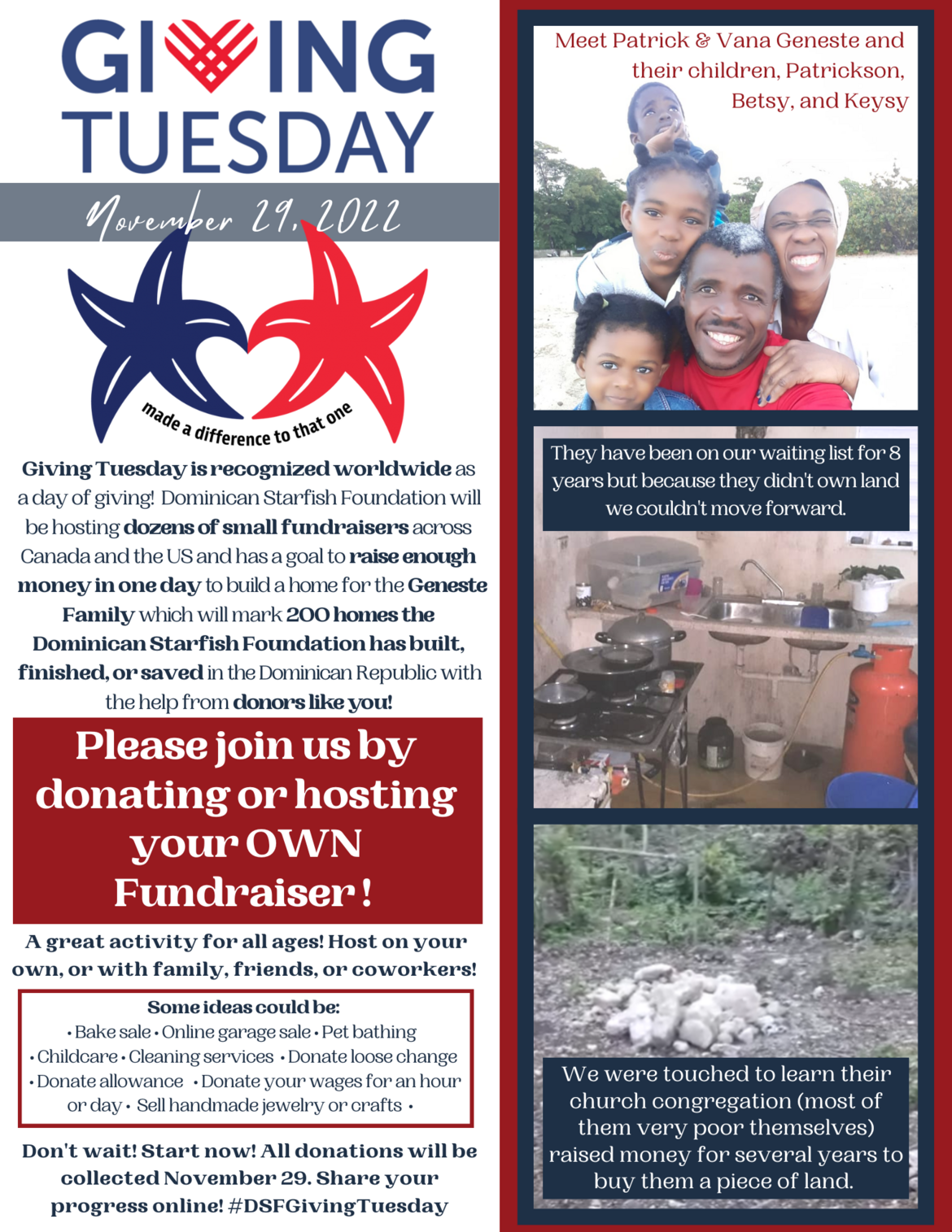 There are many ways to help! Dominican Starfish Foundation has invited people all over Canada the USA and beyond to join us for Giving Tuesday to help this family.