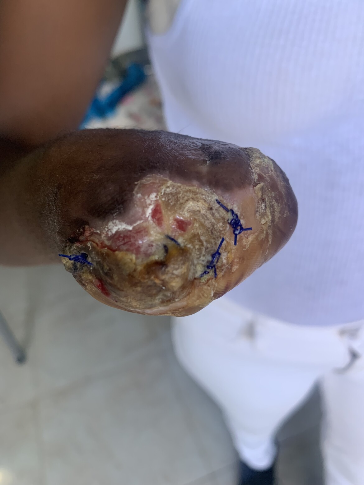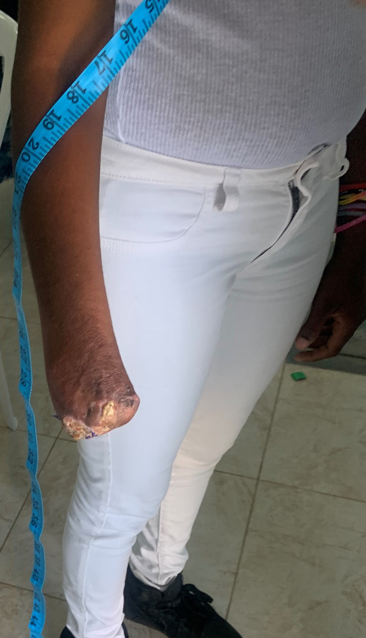 The above photo was taken 6 weeks later when we measured to help with a possible prosthesis. She will have to have an additional amputation to make a prosthetic possible.