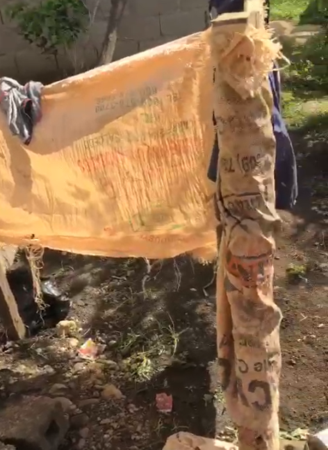 There is no bathroom. They shower with a bucket outside behind a curtain.