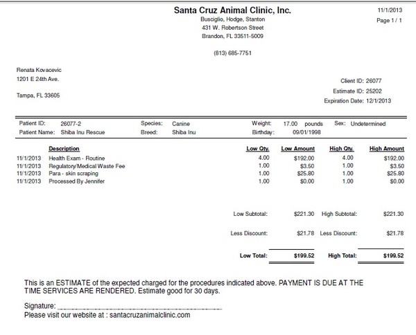 talking to the vet she takes a look at her Melinda, sores, scratches.
