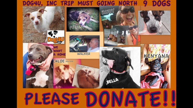 Nine Rescue dogs have the opportunity to travel 1,000 miles from South Carolina to Massachusetts to our rescue partners in order to find forever families. We are past max capacity space wise and desperately need to get trips going north this weekend and next weekend in order to free up much needed space to save more lives. None of our volunteers were able to drive this trip so we are borrowing one of our shelter partner's Animal Control Officers to drive the 2,000 mile round trip. This Officer was kind enough to take leave from work but will need to be reimbursed for his time out of work ($250- or $125 per day of travel). Without this kind driver we could not make this happen. Our fundrazr total reflects fuel expenses and paying a driver. Please consider helping us make room in our kennels and at our foster homes so that we can save more dogs. Everyone can make a difference for these deserving dogs! We appreciate all donations, large and small, they add up to make a huge difference for the animals that have no voice. Donations are Tax Deductible; Our Tax ID Number is 20-5311280. Dog4u, Inc. is a volunteer run Non profit organization but sometimes there just aren't enough volunteers available to make the 40 hour round trip. Find us at www.dog4u.org or www.facebook.com/Dog4uinc