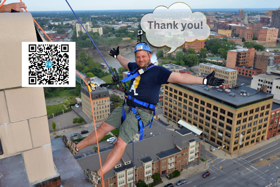 It starts with making a commitment to contribute or raise (a minimum of) $1,100 for your rappel experience. Once registered, you can amaze your family and friends with the daring feat you will take on and ask for their support (any amount big or small) to get you to your fundraising goal.