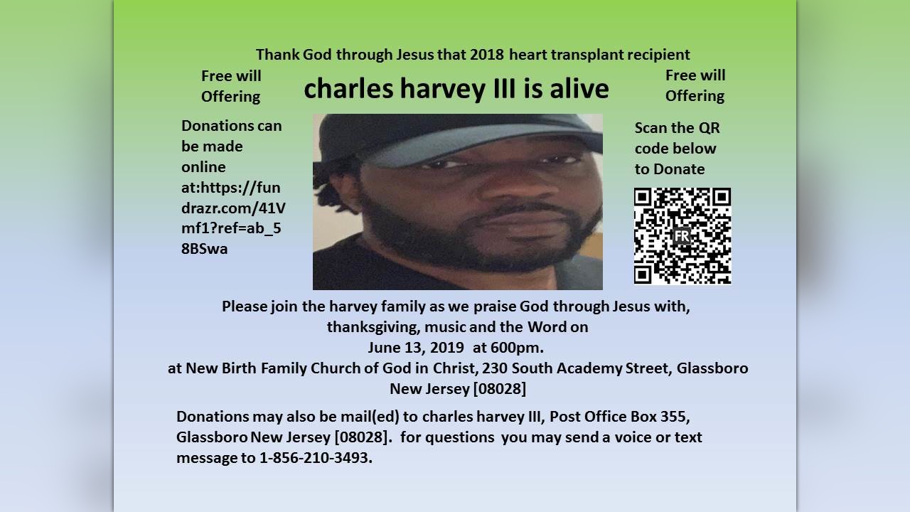 Thanking God through Jesus for charles harvey III heart transplant recipient