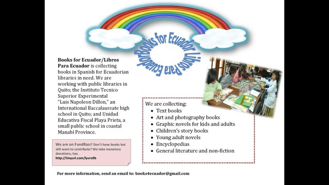 School children in Ecuador need the gift of reading. Help provide that gift by donating funds to buy and ship books to schoos and libraries in Ecuador. Currently I am working with the network of public libraries in Quito; Instituto Tecnico Superior Experimental " Luis Napoleon Dillon", an International Baccalaurate high school in Quito; and Unidad Educativa Playa Prieta, a rural school in the coastal province of Manabí.