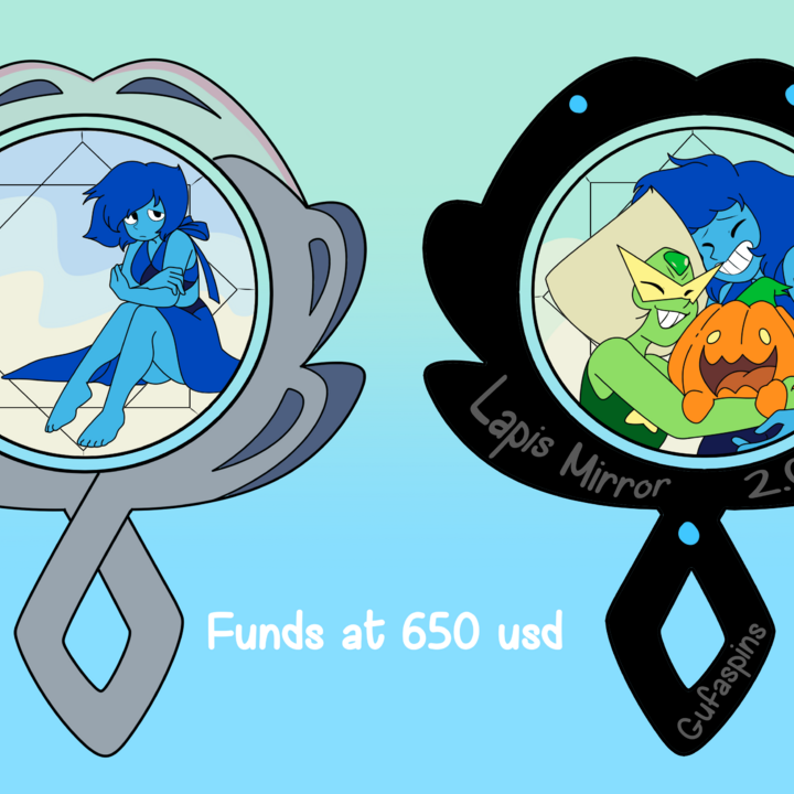 Its a 3.5" inch, hard enamel pin of one of one of my favorite character development, of out beloved character Lapis Lazuli. It will have a rotating center of 2" inches, have screenprint on the characters and background, and be LE50.