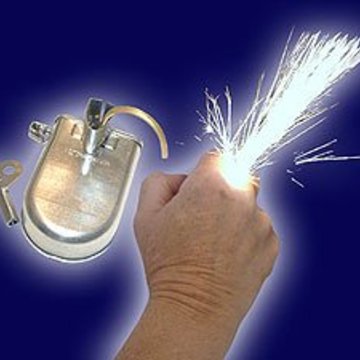 Is that smoke coming from the controls on the television set? That elevator button looks a bit funny. Is this microphone on? The magician reaches over to touch and suddenly violent sparks leap out of the object and magician's fingers! This is the good Funkenring made of metal. It is a wind-up device that uses ordinary cigarette lighter flints. It is a lot of fun and will always cause them to jump! A number of China made Funken Rings have been on the market for years, but their quality has been questionable. This one is a bit more expensive, but is made in Germany by Voit and is an excellent product.