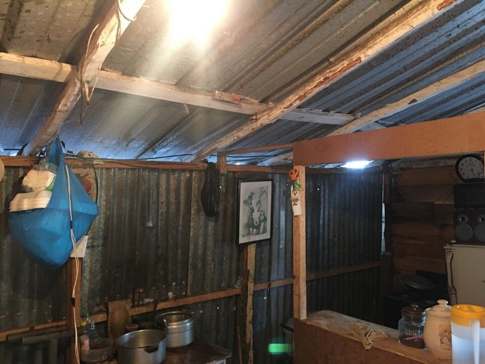 The roof is broken and falling in several places and leaks every time it rains which is very often. You can see the sun shining through a very large hole.
