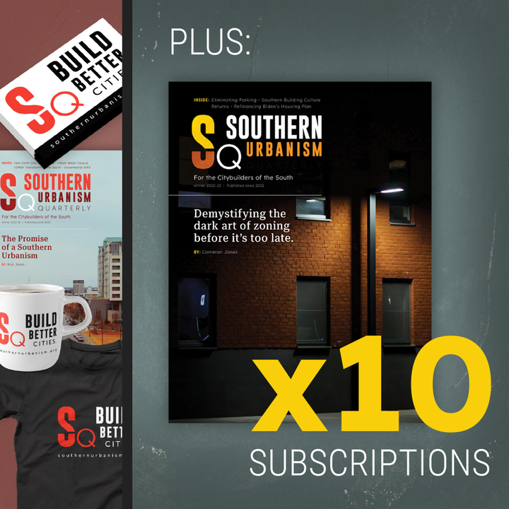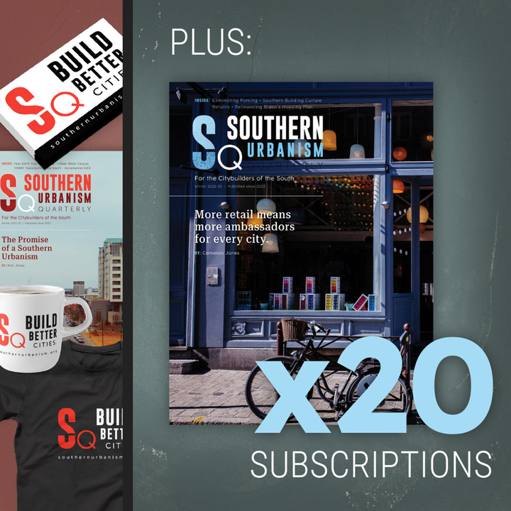 $1,000 + 20 subscriptions for clients, friends, or family; AND a priority ticket to our inaugural Southern Urbanism conference in 2023