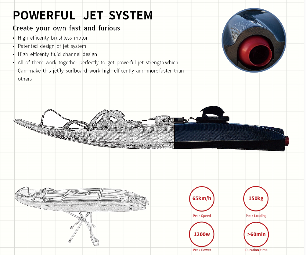 High-efficiency water flow channel and professional body design make the production running rapidly, stably and safely. Powerful motor and high-efficiency jet system make the Jet fly surfboard speed up very quickly, the max. Speed is over 60 kilometer per hour by loading 100kg.