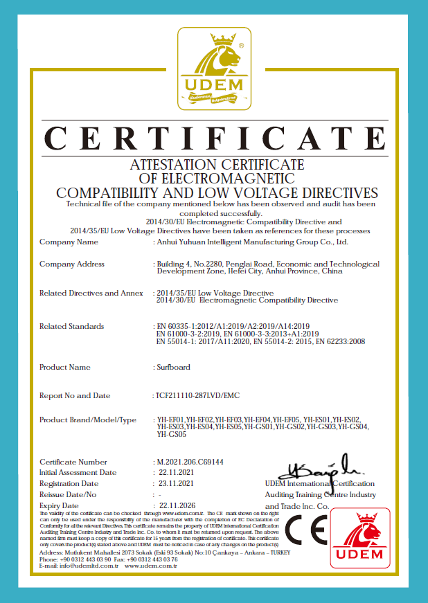 Anhui Yuhuan Intelligent Manufacturing Group Co., Ltd., is a group company ,professional engaged in the research, development,sales and service of Electric surfboard, Efoil surfboard ,motorboat, and other watersports products, with strict quality control and attentive customer service, our experienced staff are always available to discuss your requirements and ensure complete customer satisfaction.In addition, we have obtained many certificates. The products sell well in all provinces and cities in China, and are exported to East Asia, the Middle East, North America, Western Europe and other countries and regions. To perfect service, to meet the customer needs of all kinds of customer concept, the company advocates good after-sales service, common progress with customers, the concept of win-win cooperation, to provide every customer with high-quality products, one-stop procurement and the most professional.