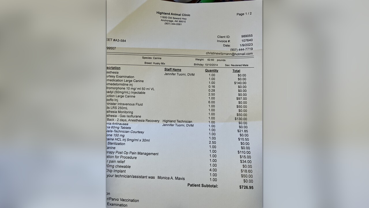 Dear All!     Approx 3 months ago, a stray husky - Dunkin - with a broken leg and porcupine quills on his face, was humanely trapped.   He received emergency vet care at Pet ER.  He has been living with his foster family and regained his health and his confidence in life.    On Monday, January 9, he was neutered at Highland Animal Clinic.    The total cost was $726 and I put it on my personal credit card for payment.